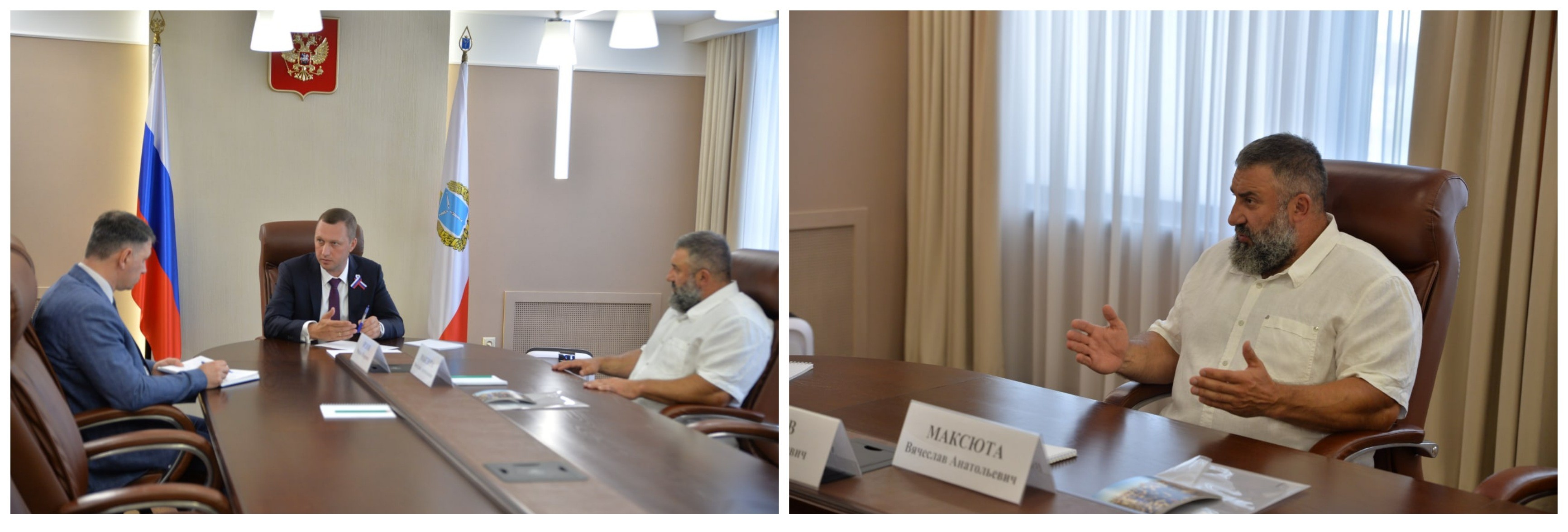 Врио губернатора Роман Бусаргин встретился с председателем комиссии по спорту, делам молодежи, развитию добровольчества и патриотическому воспитанию Общественной палаты региона Вячеславом Максютой.