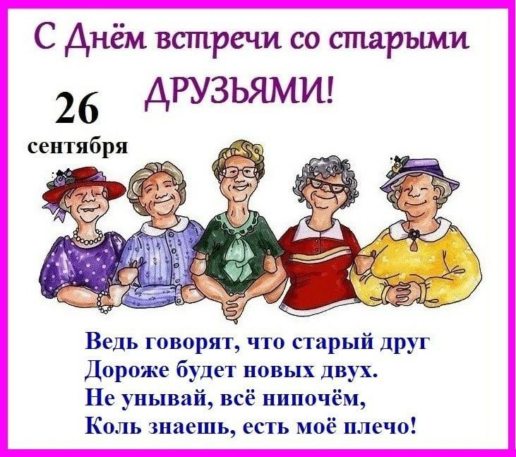 Ежегодно 26 сентября отмечают замечательный праздник, посвящённый дружбе – День встречи со старыми друзьями. Именно в этот день, независимо от жизненных обстоятельств, мы вспоминаем о своих старых добрых друзьях и стараемся с ними встретиться. Жизнь порой разводит друзей по разным городам, странам и даже континентам, а ностальгия по старым добрым временам не покидает наше сердце и душу. Главная цель этого праздника — напомнить людям о важности настоящей человеческой дружбы.
