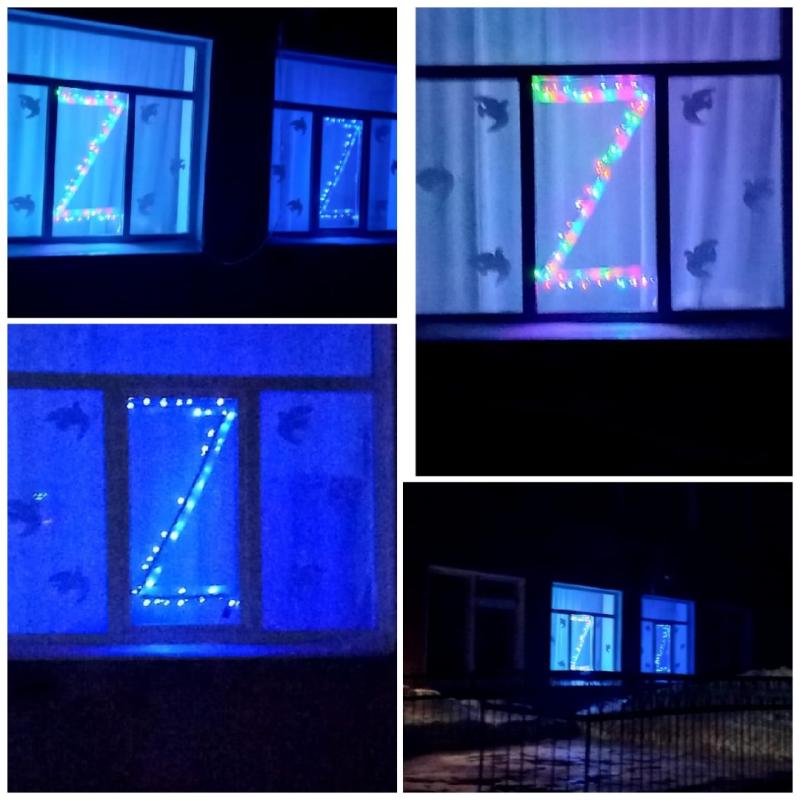 На окнах школы ребята разместили букву Z, символ, маркировку, которая наносится на военную технику российской армии, участвующей в специальной военной операции на Украине.