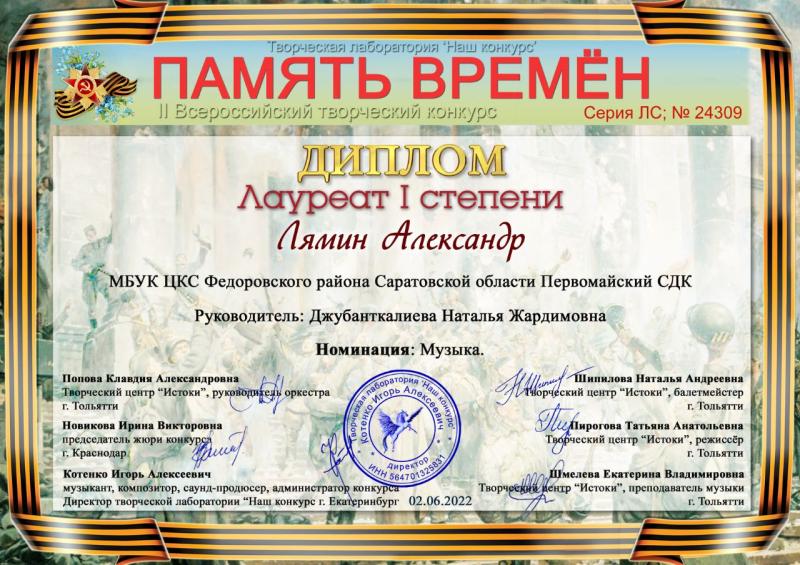 Глава Первомайского муниципального образования Александр Александрович Лямин (в номинации "Музыка") и жительница села Первомайское Татьяна Кажан (в номинации "Художественное слово") приняли участие во Всероссийском on-line конкурсе "ПАМЯТЬ ВРЕМЁН", посвящённом 77-й годовщине Победы в Великой Отечественной войне.