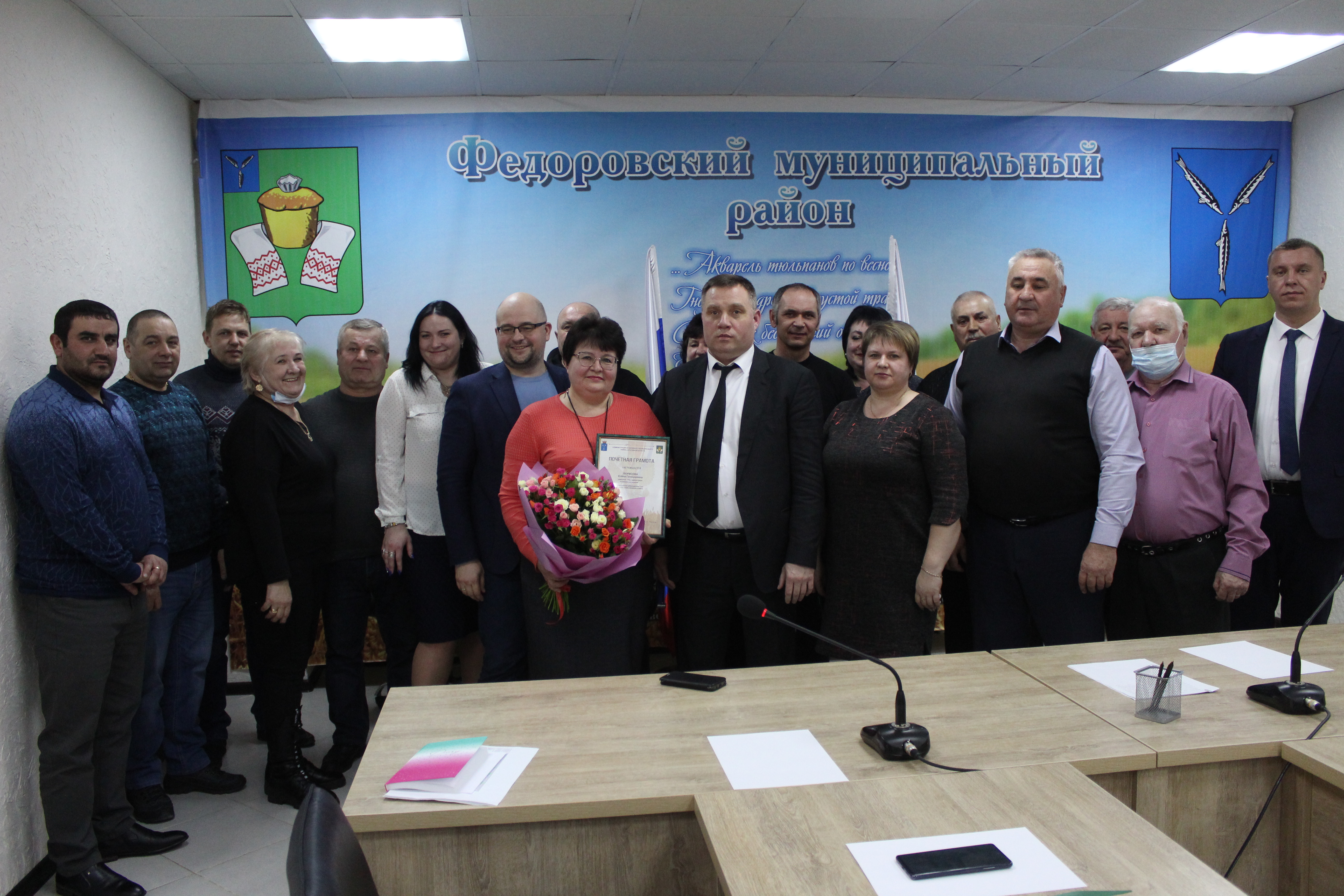 Распоряжением главы Федоровского муниципального района Алексея Валерьевича Наумова за многолетний добросовестный труд и профессионализм в работе Почетной грамотой администрации Федоровского муниципального района награждена заместитель главы администрации по социальным вопросам Елена Геннадиевна Борисова.