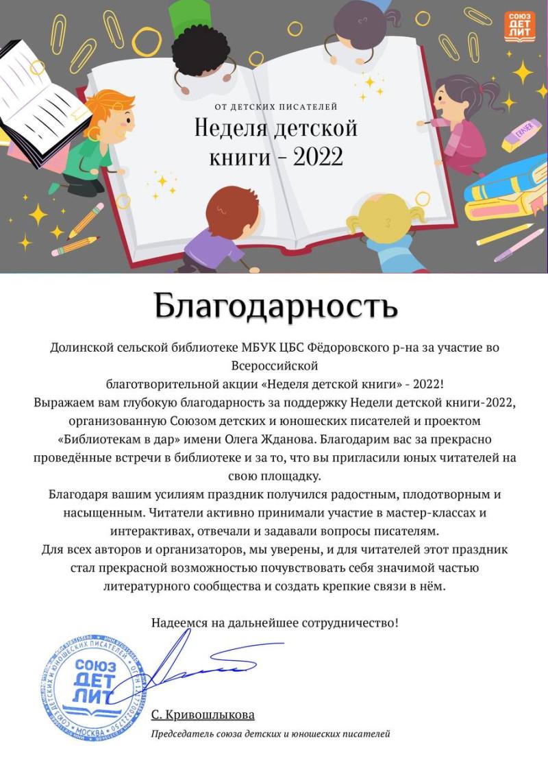 Модельной библиотеке с. Долина (библиотекарь Е. Выдыш) объявлена благодарность председателя Союза детских и юношеских писателей за участие во Всероссийской благотворительной акции "Неделя детской книги-2022".